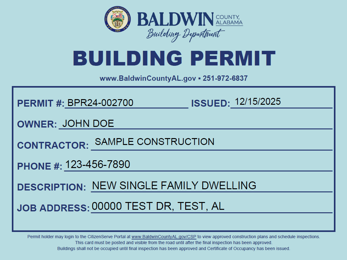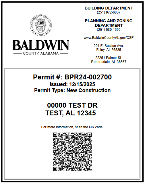 *IMPORTANT INFORMATION: If none of the required actions are completed before the expiration date, the permit will expire and the project will be in non-compliance with the building construction laws and building codes adopted by the Baldwin County Commission. Any work performed after expiration is subject to Stop Work Orders, penalty fees of $150.00 per day, and disconnection of power.